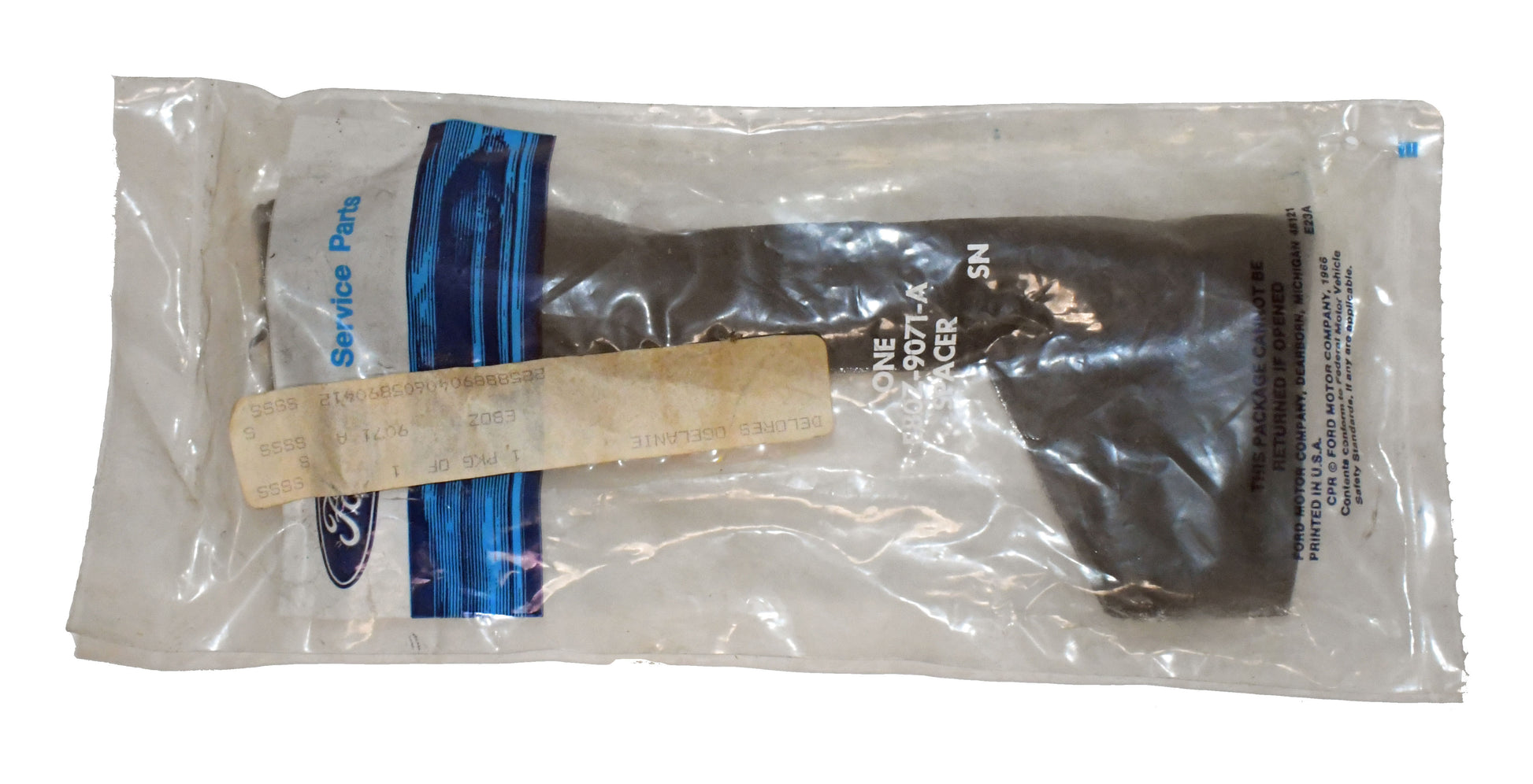 This is one brand new fuel tank mounting spacer from Ford. This genuine Ford service part carries the part number E8OZ-9071-A. Please check the vehicle compatibility information to determine if this part is correct for your application. This is a brand new part; it has never been installed on a vehicle. This is not a reproduction or copy or remanufactured part.